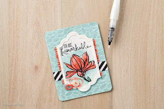 This lovely set is available from the Annual Catalog (page 128). I used SU watercolor paper (122959), black StazOn Ink (101406) and Aqua Painters (103954) in